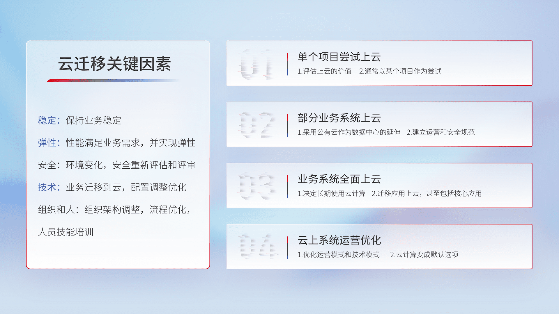 结合实际业务,,,,从规划设计、、、云平台选型、、云原生改造、、数据迁移、、、、集成交付,,迁移全过程为客户识别最佳上云路径,,做好风险识别管理,,,设计网络架构、、、身份权限、、安全审计合规、、、操作审计、、、、日志审计、、、监控告警策略、、、多站点容灾设计等,,,,对云上基础设施进行整体规划,,,提升IT治理水平,,以满足弹性、、高可用、、、高性能的需求。。。