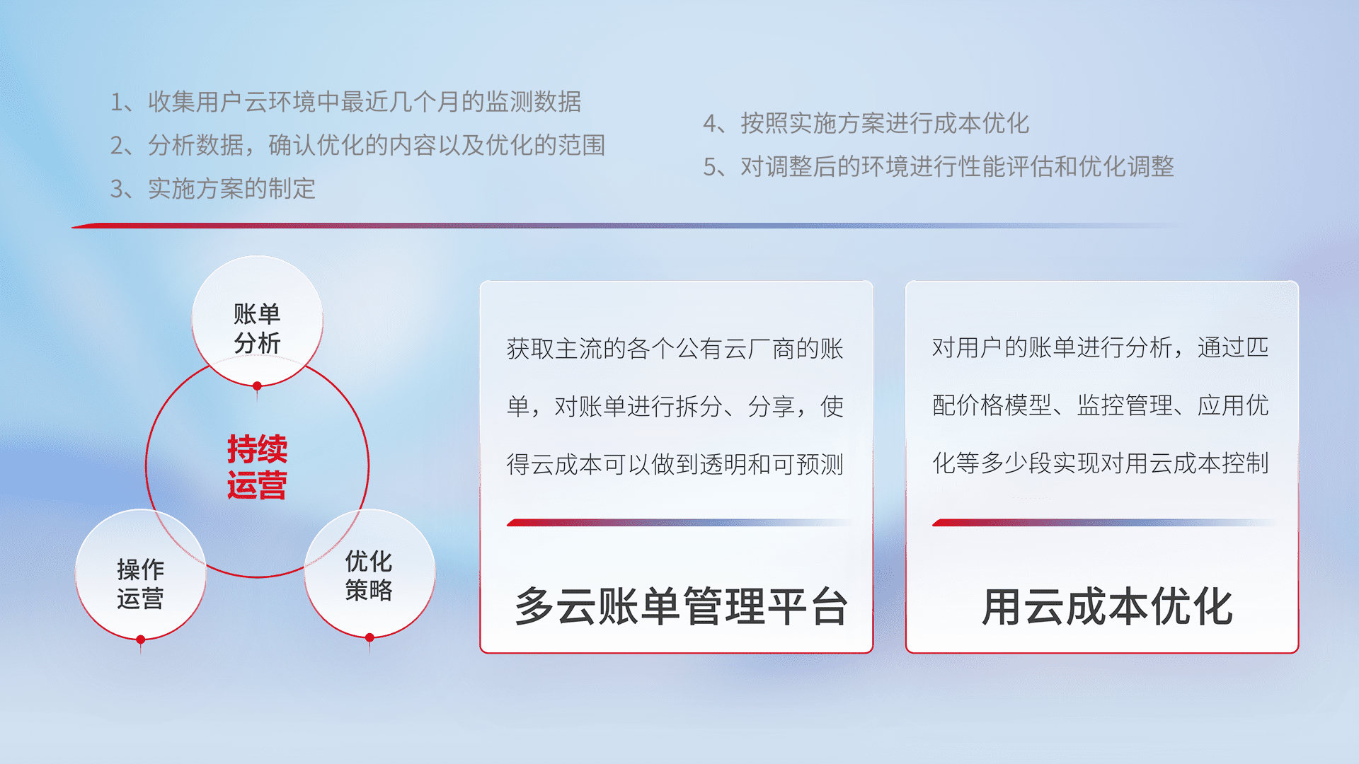 通过多云纳管,,,以统一的资源数据模型把客户的云资源进行抽象和封装,,,进而实现对多云资源的统一操作,,保障云资源管理的可靠性、、、稳定性与可用性。。。量身定制化运维内容,,,配置、、、开发运维、、、、补丁管理、、、备份、、、、监控、、、认证和访问管理、、审计和日常巡检等,,,保障在用云过程中的可靠度,,,稳定度以及高可用率。。。。